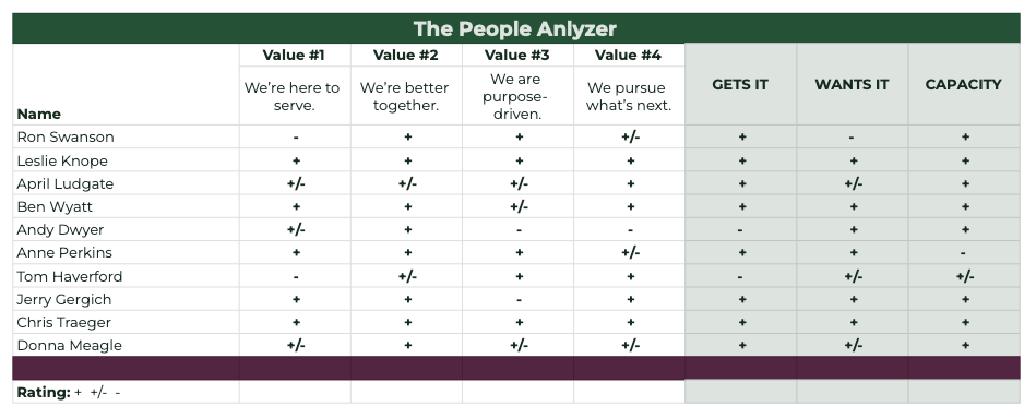 Taking inventory of your team helps you answer critical questions: Are the people on your team contributing to your company’s growth, or are they creating friction? Are conflicts within the team leading to productive growth or signaling a deeper disconnect with your values? Gino Wickman’s People Analyzer, introduced in his book Traction, is an excellent tool to evaluate your team members systematically and objectively. By identifying patterns and assessing alignment with your core values, you can make informed decisions about your team’s future.