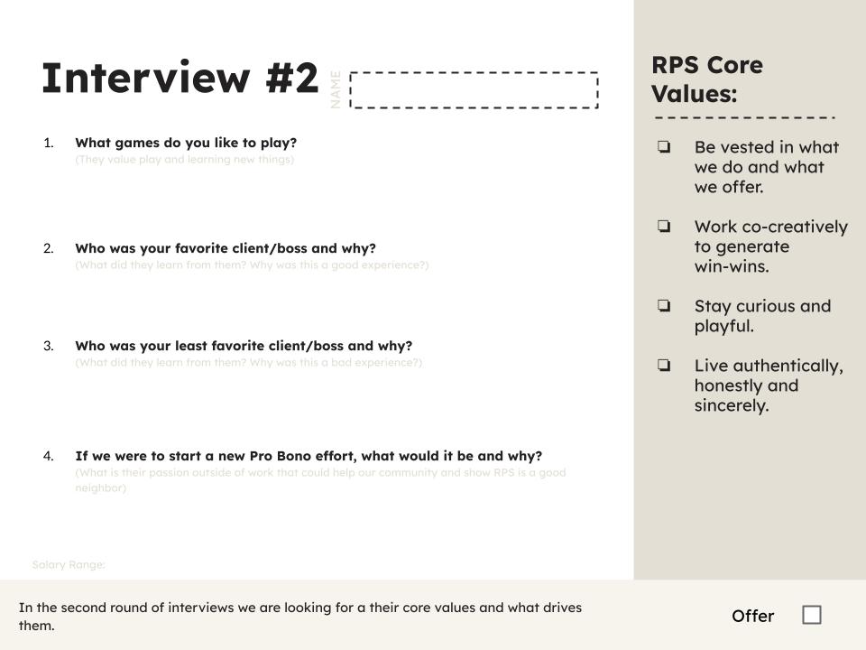The first interview is conducted by the team and serves as a culture-fit assessment. This should be a 30-minute interview with 3 key questions designed to evaluate: